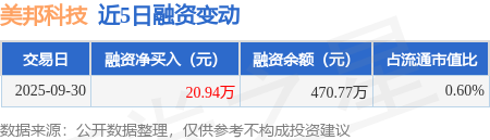 证券之星消息,9月30日,美邦科技(920471)融资买入23.8万元,融资偿还2.87万元,融资净买入20.94万元,融资余额470.77万元。