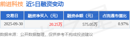 证券之星消息,9月30日,前进科技(920679)融资买入23.98万元,融资偿还3.73万元,融资净买入20.25万元,融资余额575.05万元。