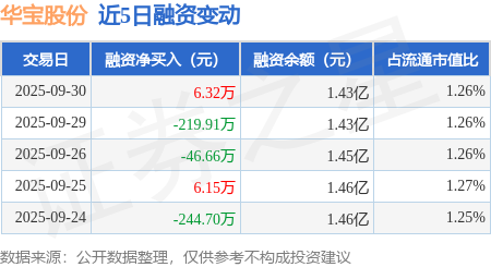 证券之星消息,9月30日,华宝股份(300741)融资买入241.36万元,融资偿还235.04万元,融资净买入6.32万元,融资余额1.43亿元。