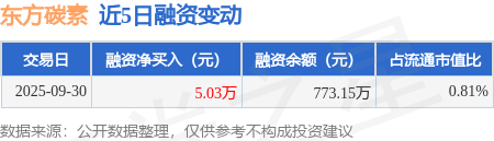 证券之星消息,9月30日,东方碳素(920175)融资买入18.43万元,融资偿还13.4万元,融资净买入5.03万元,融资余额773.15万元。