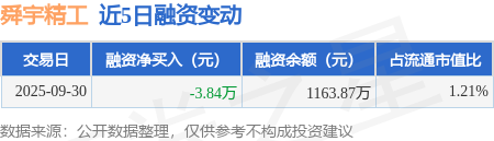 证券之星消息,9月30日,舜宇精工(920906)融资买入97.58万元,融资偿还101.43万元,融资净卖出3.84万元,融资余额1163.87万元。