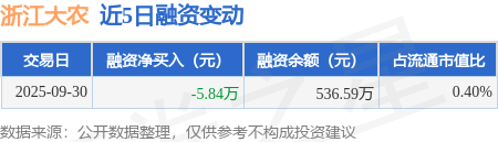 证券之星消息,9月30日,浙江大农(920855)融资买入21.03万元,融资偿还26.87万元,融资净卖出5.84万元,融资余额536.59万元。