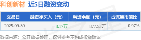 证券之星消息,9月30日,科创新材(920580)融资买入75.82万元,融资偿还83.99万元,融资净卖出8.17万元,融资余额877.53万元。