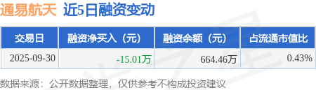 证券之星消息,9月30日,通易航天(920642)融资买入68.99万元,融资偿还84.0万元,融资净卖出15.01万元,融资余额664.46万元。