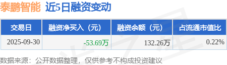 证券之星消息,9月30日,泰鹏智能(920132)融资买入7.36万元,融资偿还61.05万元,融资净卖出53.69万元,融资余额132.26万元。