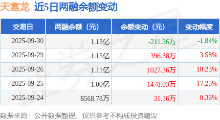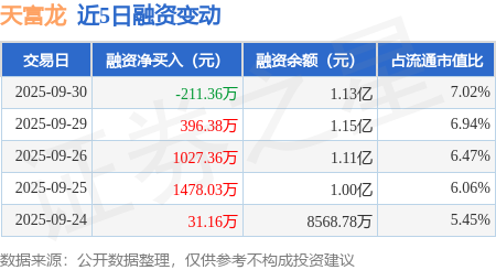 证券之星消息,9月30日,天富龙(603406)融资买入3023.94万元,融资偿还3235.3万元,融资净卖出211.36万元,融资余额1.13亿元。