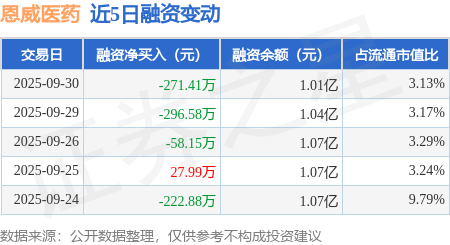 证券之星消息,9月30日,恩威医药(301331)融资买入241.34万元,融资偿还512.75万元,融资净卖出271.41万元,融资余额1.01亿元。