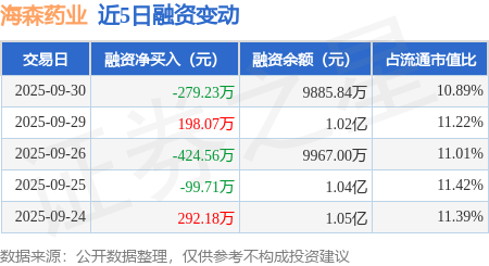证券之星消息,9月30日,海森药业(001367)融资买入69.26万元,融资偿还348.49万元,融资净卖出279.23万元,融资余额9885.84万元。