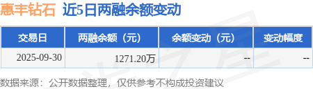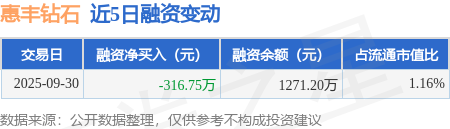 证券之星消息,9月30日,惠丰钻石(920725)融资买入7.43万元,融资偿还324.18万元,融资净卖出316.75万元,融资余额1271.2万元。