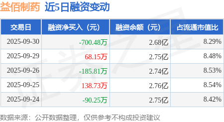 证券之星消息,9月30日,益佰制药(600594)融资买入393.97万元,融资偿还1094.44万元,融资净卖出700.48万元,融资余额2.68亿元,近20个交易日中有11个交易日出现融资净买入。