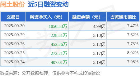 证券之星消息,9月30日,闰土股份(002440)融资买入469.25万元,融资偿还1519.78万元,融资净卖出1050.53万元,融资余额4.99亿元。