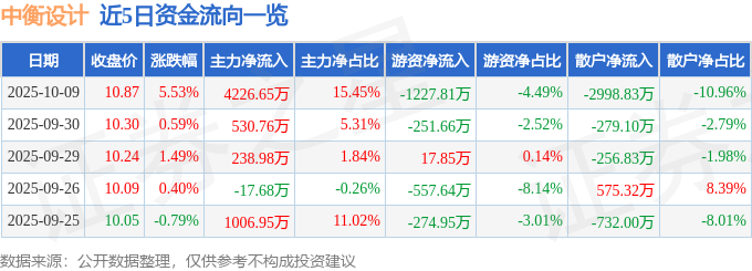 证券之星消息,截至2025年10月9日收盘,中衡设计(603017)报收于10.87元,上涨5.53%,换手率9.36%,成交量25.86万手,成交额2.74亿元。
