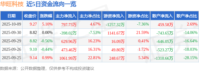 证券之星消息,截至2025年10月9日收盘,华旺科技(605377)报收于9.27元,上涨5.1%,换手率3.33%,成交量18.55万手,成交额1.71亿元。