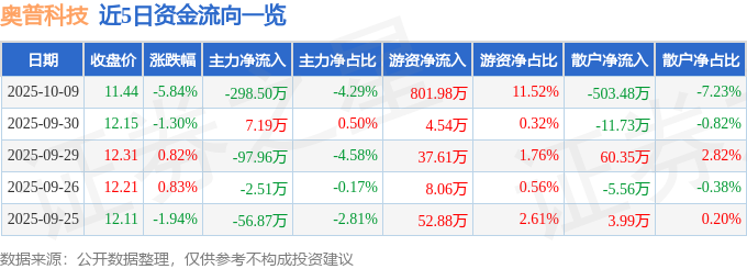 证券之星消息,截至2025年10月9日收盘,奥普科技(603551)报收于11.44元,下跌5.84%,换手率1.56%,成交量6.0万手,成交额6961.58万元。