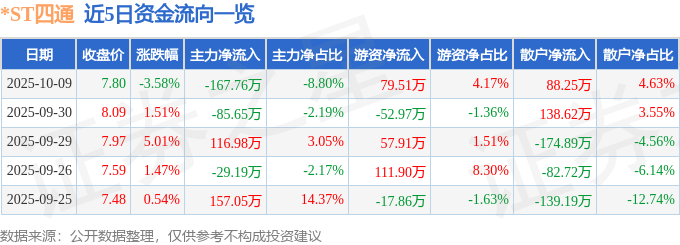证券之星消息,截至2025年10月9日收盘,*ST四通(603838)报收于7.8元,下跌3.58%,换手率0.76%,成交量2.43万手,成交额1906.27万元。