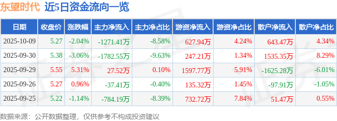 证券之星消息,截至2025年10月9日收盘,东望时代(600052)报收于5.27元,下跌2.04%,换手率3.33%,成交量28.08万手,成交额1.48亿元。