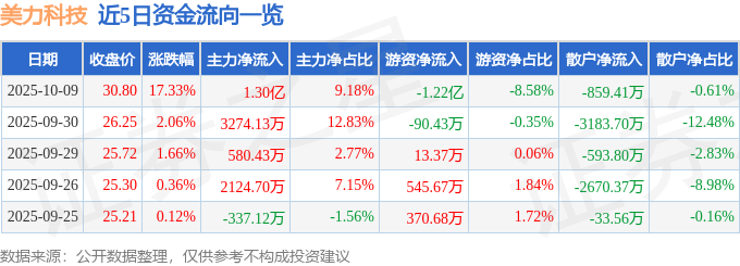 证券之星消息,截至2025年10月9日收盘,美力科技(300611)报收于30.8元,上涨17.33%,换手率32.11%,成交量47.63万手,成交额14.17亿元。