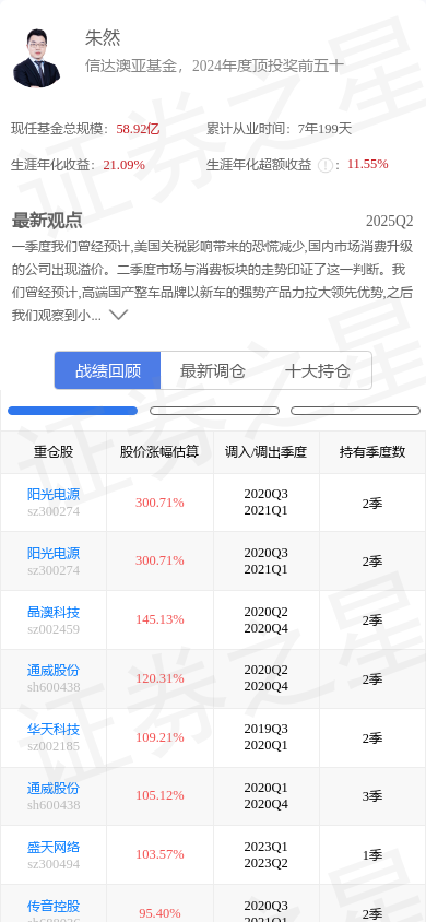 华懋科技(603306)是基金经理朱然的重仓股。,其在整个职业生涯内年化收益高达21.09%。朱然的大佬持仓 - 战绩回顾截图如下: