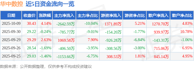 证券之星消息,截至2025年10月9日收盘,华中数控(300161)报收于30.43元,上涨4.14%,换手率4.49%,成交量8.76万手,成交额2.63亿元。