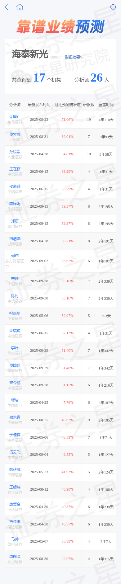 如果您对这家公司感兴趣,可以参考证星研究院统计的海泰新光的分析师业绩预测数据,其中根据东吴证券的分析师朱国广预测公司未来PE为22.0(更多特色估值数据尽在证星研究院,所有数据均来源公开资料,期且所有资料都存在一定时间滞后,所有相关数据均不可作为投资决策单一依据)。