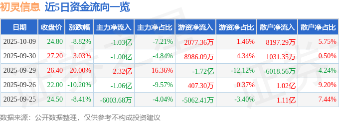 证券之星消息,截至2025年10月9日收盘,初灵信息(300250)报收于24.8元,下跌8.82%,换手率35.55%,成交量56.06万手,成交额14.25亿元。