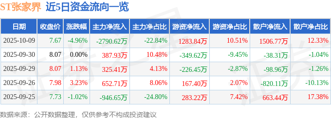 证券之星消息,截至2025年10月9日收盘,ST张家界(000430)报收于7.67元,下跌4.96%,换手率4.77%,成交量15.82万手,成交额1.22亿元。