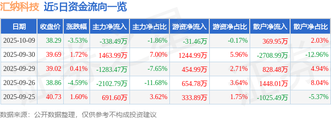 证券之星消息,截至2025年10月9日收盘,汇纳科技(300609)报收于38.29元,下跌3.53%,换手率3.93%,成交量4.71万手,成交额1.82亿元。