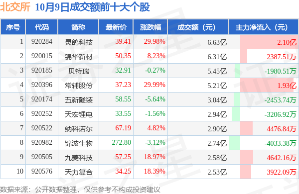 当日北交所成交额前10大个股中6只个股收涨,平均涨幅18.4%,其中灵鸽科技(920284)以成交额6.63亿元排第一。从主力资金流入看,成交额前10大个股中有6只个股呈现主力资金净流入。