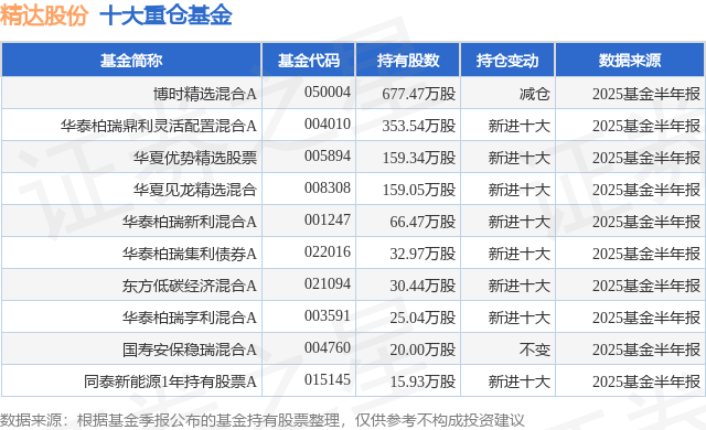 根据2025基金半年报公募基金重仓股数据,重仓该股的公募基金共12家,其中持有数量最多的公募基金为博时基金的博时精选混合A。博时精选混合A目前规模为13.34亿元,最新净值1.8213(9月30日),较上一交易日下跌0.64%,近一年上涨32.08%。该公募基金现任基金经理为冀楠。冀楠在任的基金产品包括:博时核心资产精选混合A,管理时间为2021年9月17日至今,期间收益率为19.19%;博时厚泽回报混合A,管理时间为2021年11月8日至今,期间收益率为-4.47%;博时卓越品牌混合(LOF)A,管理时间为2022年7月22日至今,期间收益率为-10.69%。