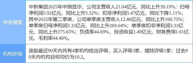 2025年8月28日,开源证券研究员齐东,胡耀文,杜致远发布了对中新集团的研报《公司信息更新报告:营收利润同比增长,区中园出租率维持高位》,该研报对中新集团给出“买入”评级。研报中预计公司2025-2027年归母净利润分别为8.3、9.0、10.2亿,EPS分别为0.55、0.60、0.68元,当前股价对应PE分别为13.3、12.2、10.8倍,公司业务协同发展,园区运营质量提升,新兴业务有望增厚业绩,维持“买入”评级。证券之星数据中心根据近三年发布的研报数据计算,该研报作者对此股的盈利预测准确度为32.83%。