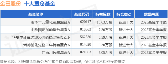 根据2025基金半年报公募基金重仓股数据,重仓该股的公募基金共5家,其中持有数量最多的公募基金为南华基金的南华丰元量化选股混合A。南华丰元量化选股混合A目前规模为0.26亿元,最新净值1.3876(9月30日),较上一交易日上涨0.04%,近一年上涨20.83%。该公募基金现任基金经理为黄志钢 康冬。黄志钢在任的基金产品包括:南华丰汇混合A,管理时间为2022年3月5日至今,期间收益率为87.26%;南华丰睿量化选股混合A,管理时间为2024年11月5日至今,期间收益率为20.45%;南华丰利量化选股混合A,管理时间为2025年3月7日至今,期间收益率为9.88%。康冬在任的基金产品包括:南华中证杭州湾区ETF联接A,管理时间为2023年8月30日至今,期间收益率为14.55%;南华中证杭州湾区ETF,管理时间为2023年8月30日至今,期间收益率为15.28%;南华丰利量化选股混合A,管理时间为2025年3月14日至今,期间收益率为9.87%。