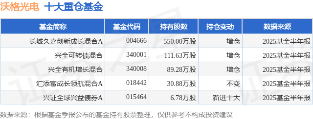 根据2025基金半年报公募基金重仓股数据,重仓该股的公募基金共5家,其中持有数量最多的公募基金为长城基金的长城久嘉创新成长混合A。长城久嘉创新成长混合A目前规模为20.51亿元,最新净值2.2669(9月30日),较上一交易日上涨1.29%,近一年上涨62.42%。该公募基金现任基金经理为尤国梁。尤国梁在任的基金产品包括:长城景气成长混合A,管理时间为2023年9月12日至今,期间收益率为37.88%。