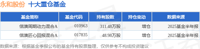 根据2025基金半年报公募基金重仓股数据,重仓该股的公募基金共2家,其中持有数量最多的公募基金为信达澳亚基金的信澳周期动力混合A。信澳周期动力混合A目前规模为6.79亿元,最新净值1.8387(9月30日),较上一交易日上涨1.06%,近一年上涨47.47%。该公募基金现任基金经理为吴清宇 张明烨。吴清宇在任的基金产品包括:信澳景气优选混合A,管理时间为2021年12月21日至今,期间收益率为67.88%;信澳优势产业混合A,管理时间为2023年5月29日至今,期间收益率为131.48%;信澳匠心严选一年持有混合A,管理时间为2024年11月29日至今,期间收益率为96.4%。张明烨在任的基金产品包括:信澳匠心回报混合A,管理时间为2024年3月11日至今,期间收益率为105.26%;