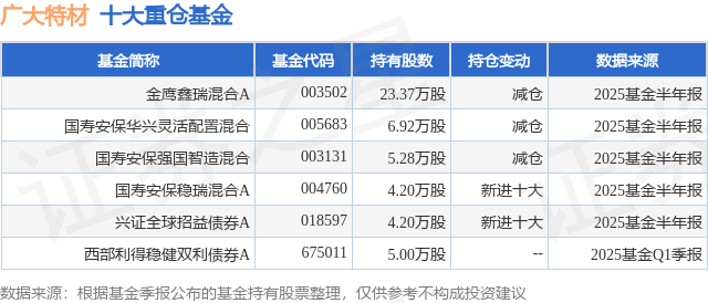 根据2025基金半年报公募基金重仓股数据,重仓该股的公募基金共5家,其中持有数量最多的公募基金为金鹰基金的金鹰鑫瑞混合A。金鹰鑫瑞混合A目前规模为2.48亿元,最新净值1.3193(9月30日),较上一交易日上涨0.53%,近一年上涨5.28%。该公募基金现任基金经理为龙悦芳 倪超。龙悦芳在任的基金产品包括:金鹰添瑞中短债A,管理时间为2017年9月21日至今,期间收益率为30.41%;金鹰添祥中短债A,管理时间为2018年9月19日至今,期间收益率为25.62%;金鹰年年邮享一年持有债券A,管理时间为2021年11月10日至今,期间收益率为9.52%。倪超在任的基金产品包括:金鹰行业优势混合A,管理时间为2015年6月11日至今,期间收益率为53.09%;金鹰元和灵活配置混合A,管理时间为2020年6月20日至今,期间收益率为75.33%;金鹰年年邮享一年持有债券A,管理时间为2021年11月25日至今,期间收益率为9.48%。