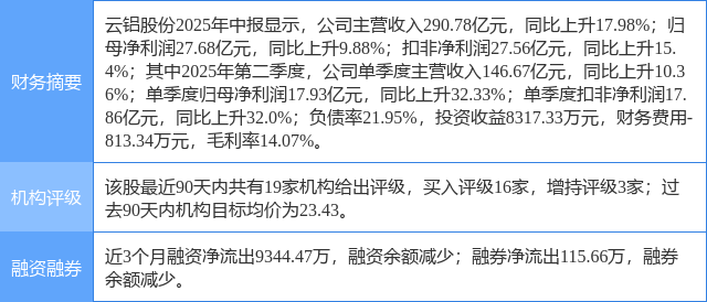 2025年8月26日,民生证券研究员邱祖学,南雪源发布了对云铝股份的研报《2025年半年报点评:Q2业绩大幅增长,分红超预期》,该研报对云铝股份给出“买入”评级。研报中预计公司2025-2027年将实现归母净利67.2亿元、80.0亿元和84.2亿元,对应现价的PE分别为10、8和8倍,维持“推荐”评级。证券之星数据中心根据近三年发布的研报数据计算,该研报作者对此股的盈利预测准确度为76.68%。