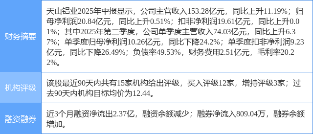 2025年8月29日,开源证券研究员孙二春,温佳贝发布了对天山铝业的研报《公司信息更新报告:具备行业稀缺的成长属性,投资价值凸显》,该研报对天山铝业给出“买入”评级。研报中预计公司2025~2027年实现归母净利润分别为47.09、56.02、64.29亿元(此前预计分别为46.85、55.15、61.63亿元),同比分别变动+5.7%、+19.0%、+14.8%,EPS分别为1.01、1.20、1.38元/股,对应2025年8月29日收盘价PE分别7.3、6.1、5.3倍,公司一体化布局,区位优势突出,维持“买入”评级。证券之星数据中心根据近三年发布的研报数据计算,该研报作者对此股的盈利预测准确度为94.61%。