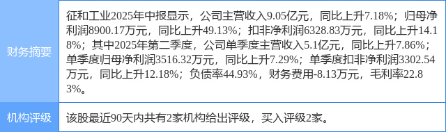 2025年9月9日,中邮证券研究员刘卓,陈基赟发布了对征和工业的研报《业绩稳健增长,静待高端市场放量》,该研报对征和工业给出“买入”评级。研报中预计公司2025-2027年营收分别为19.86、22.51、25.24亿元,同比增速分别为8.22%、13.35%、12.14%;归母净利润分别为1.70、1.97、2.44亿元,同比增速分别为30.10%、15.71%、23.55%。公司2025-2027年业绩对应PE估值分别为23.03、19.90、16.11,维持“买入”评级。证券之星数据中心根据近三年发布的研报数据计算,该研报作者对此股的盈利预测准确度为59.41%。