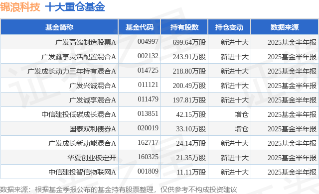 根据2025基金半年报公募基金重仓股数据,重仓该股的公募基金共17家,其中持有数量最多的公募基金为广发基金的广发高端制造股票A。广发高端制造股票A目前规模为44.64亿元,最新净值1.489(9月30日),较上一交易日上涨1.47%,近一年下跌2.57%。该公募基金现任基金经理为郑澄然。郑澄然在任的基金产品包括:广发鑫享灵活配置混合A,管理时间为2020年5月20日至今,期间收益率为58.41%;广发兴诚混合A,管理时间为2021年1月6日至今,期间收益率为-47.26%;广发诚享混合A,管理时间为2021年2月8日至今,期间收益率为-47.41%。