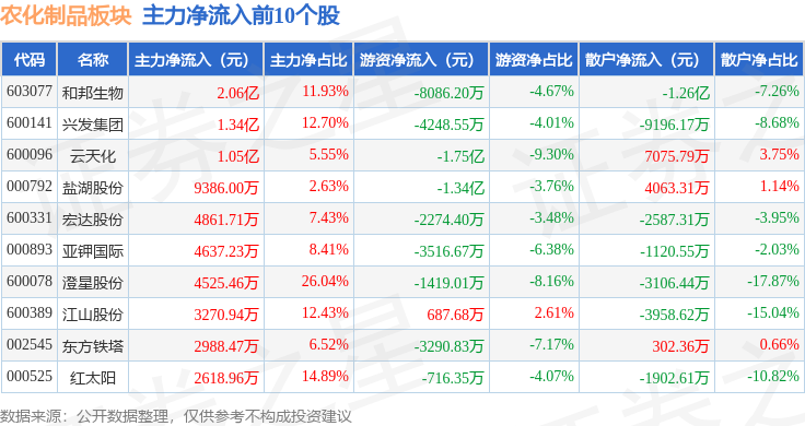 从资金流向上来看,当日农化制品板块主力资金净流入4.14亿元,游资资金净流出4.95亿元,散户资金净流入8108.69万元。农化制品板块个股资金流向见下表: