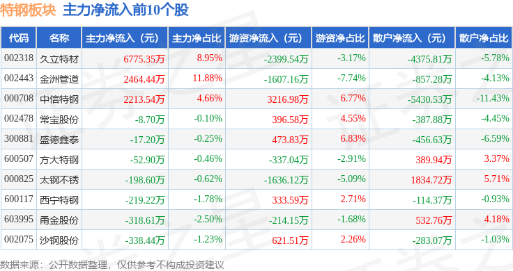 从资金流向上来看,当日特钢板块主力资金净流入8835.18万元,游资资金净流出1377.01万元,散户资金净流出7458.17万元。特钢板块个股资金流向见下表: