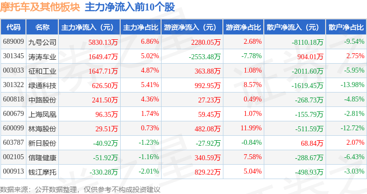 从资金流向上来看,当日摩托车及其他板块主力资金净流出1.8亿元,游资资金净流入1.27亿元,散户资金净流入5276.62万元。摩托车及其他板块个股资金流向见下表:
