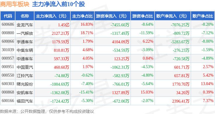 从资金流向上来看,当日商用车板块主力资金净流出4.47亿元,游资资金净流入2.33亿元,散户资金净流入2.14亿元。商用车板块个股资金流向见下表: