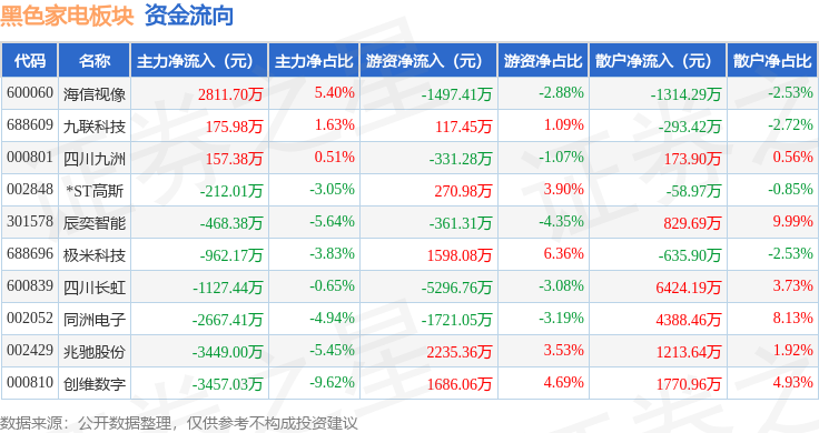从资金流向上来看,当日黑色家电板块主力资金净流出9198.38万元,游资资金净流出3299.88万元,散户资金净流入1.25亿元。黑色家电板块个股资金流向见下表: