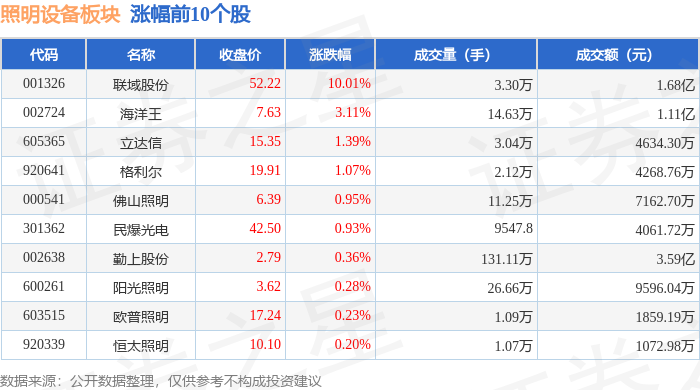 证券之星消息,10月9日照明设备板块较上一交易日上涨0.16%,联域股份领涨。当日上证指数报收于3933.97,上涨1.32%。深证成指报收于13725.56,上涨1.47%。照明设备板块个股涨跌见下表: