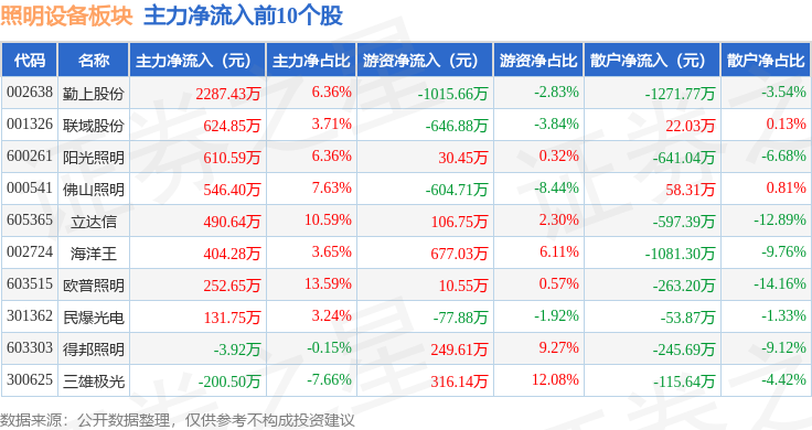 从资金流向上来看,当日照明设备板块主力资金净流出2133.54万元,游资资金净流入4629.88万元,散户资金净流出2496.34万元。照明设备板块个股资金流向见下表: