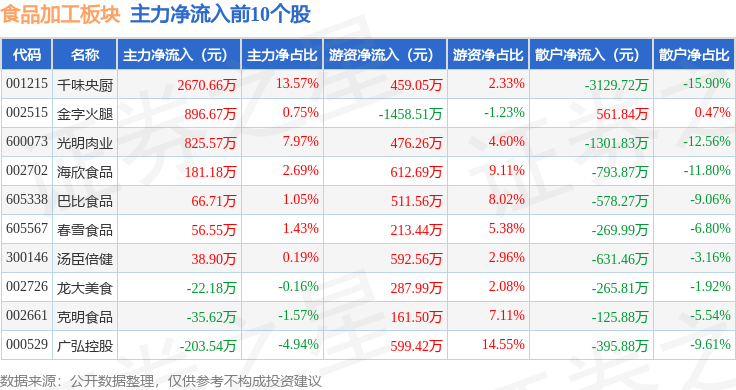 从资金流向上来看,当日食品加工板块主力资金净流出9965.89万元,游资资金净流入5635.02万元,散户资金净流入4330.86万元。食品加工板块个股资金流向见下表: