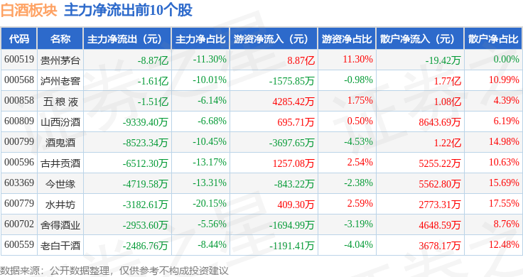 从资金流向上来看,当日白酒板块主力资金净流出16.86亿元,游资资金净流入8.56亿元,散户资金净流入8.3亿元。白酒板块个股资金流向见下表: