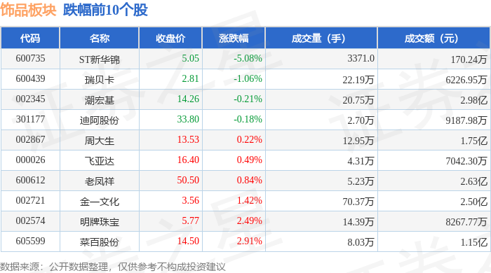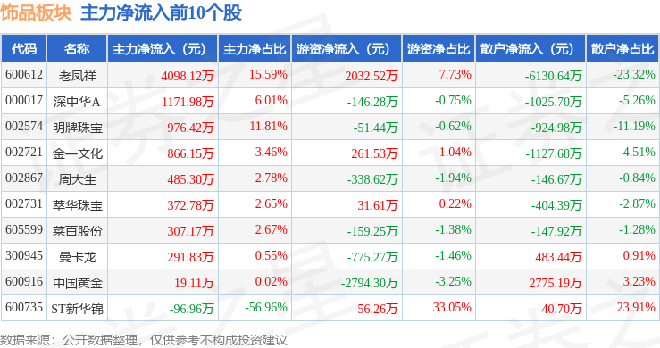 从资金流向上来看,当日饰品板块主力资金净流入3423.1万元,游资资金净流出2302.7万元,散户资金净流出1120.41万元。饰品板块个股资金流向见下表: