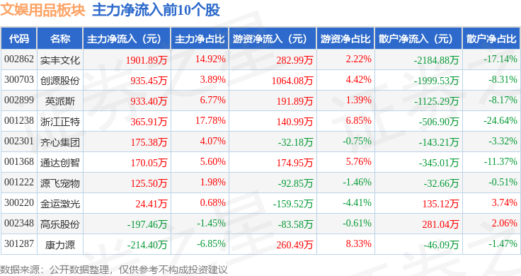 从资金流向上来看,当日文娱用品板块主力资金净流出1.52亿元,游资资金净流入1.17亿元,散户资金净流入3477.22万元。文娱用品板块个股资金流向见下表: