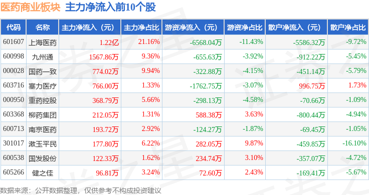 从资金流向上来看,当日医药商业板块主力资金净流入239.97万元,游资资金净流出4578.89万元,散户资金净流入4338.92万元。医药商业板块个股资金流向见下表:
